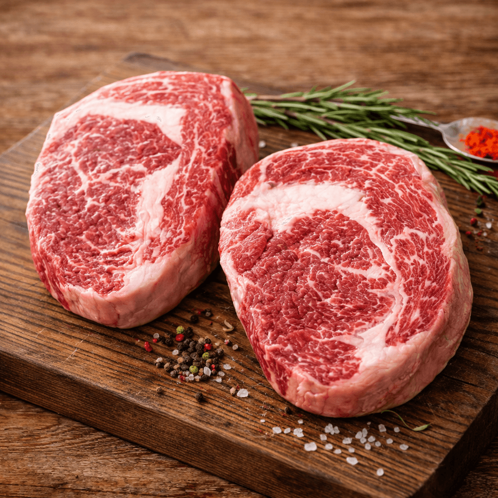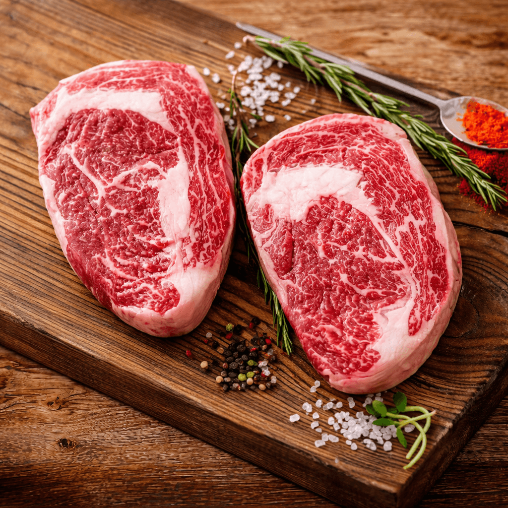 Beef Marbling Score (BMS) to specjalistyczna skala stosowana do oceny ilości oraz rozmieszczenia tłuszczu śródmięśniowego w mięsie wołowym. W przypadku steka Ribeye Premium poziom 4+ oznacza wyraźne, ale wciąż równomiernie rozłożone przerosty tłuszczu, które podczas obróbki cieplnej stopniowo się wytapiają. W efekcie mięso zyskuje niezwykle maślaną konsystencję, a jego smak staje się jeszcze bardziej intensywny i głęboki. To właśnie marmurkowatość na tym poziomie sprawia, że każdy kęs charakteryzuje się idealnym balansem między soczystością a strukturą, bez uczucia nadmiernej tłustości.