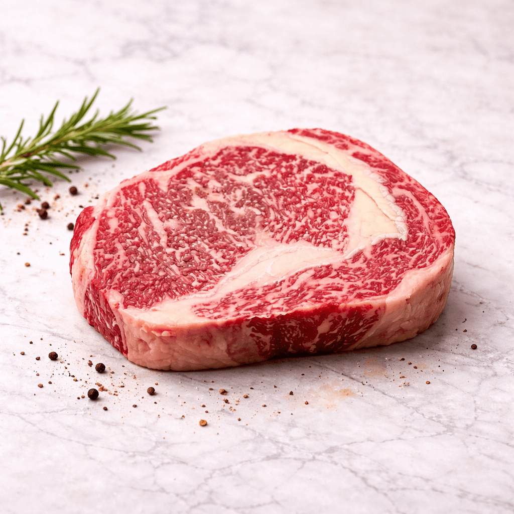 Beef Marbling Score 5–7 oznacza wyraźne, lecz niezbyt gęste przerosty tłuszczu śródmięśniowego. To daje mięsu kremową strukturę, odpowiednią soczystość i subtelne nuty orzechowe. W przeciwieństwie do bogatych Wagyu, Ribeye SWAMI oferuje wyważony profil, gdzie tłuszcz podkreśla, a nie dominuje – dla doskonałego, naturalnego smaku.