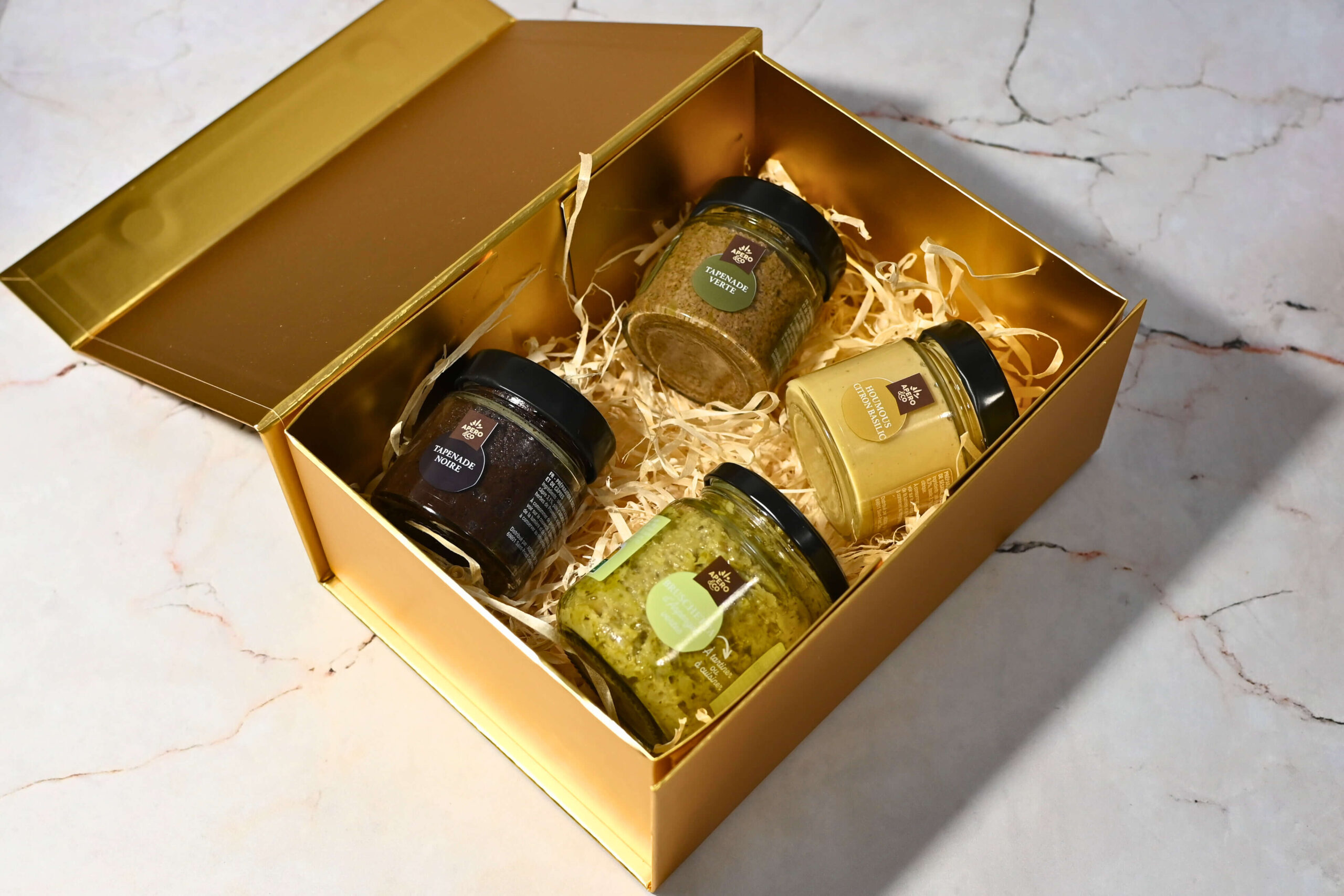 Zestaw prezentowy Apéritif à la Française to cztery francuskie przysmaki: tapenada z czarnych oliwek, tapenada z zielonych oliwek, bruschetta z zielonych szparagów i hummus bazyliowo-cytrynowy.