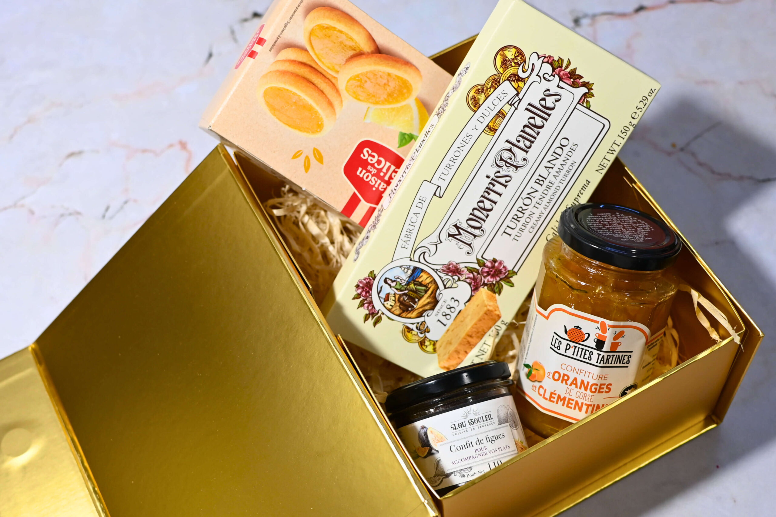 Zawiera autentyczne francuskie produkty premium: terrinę z kaczki z armaniakiem, krem z kasztanów, ciasteczka z parmezanem i chipsy czekoladowe.